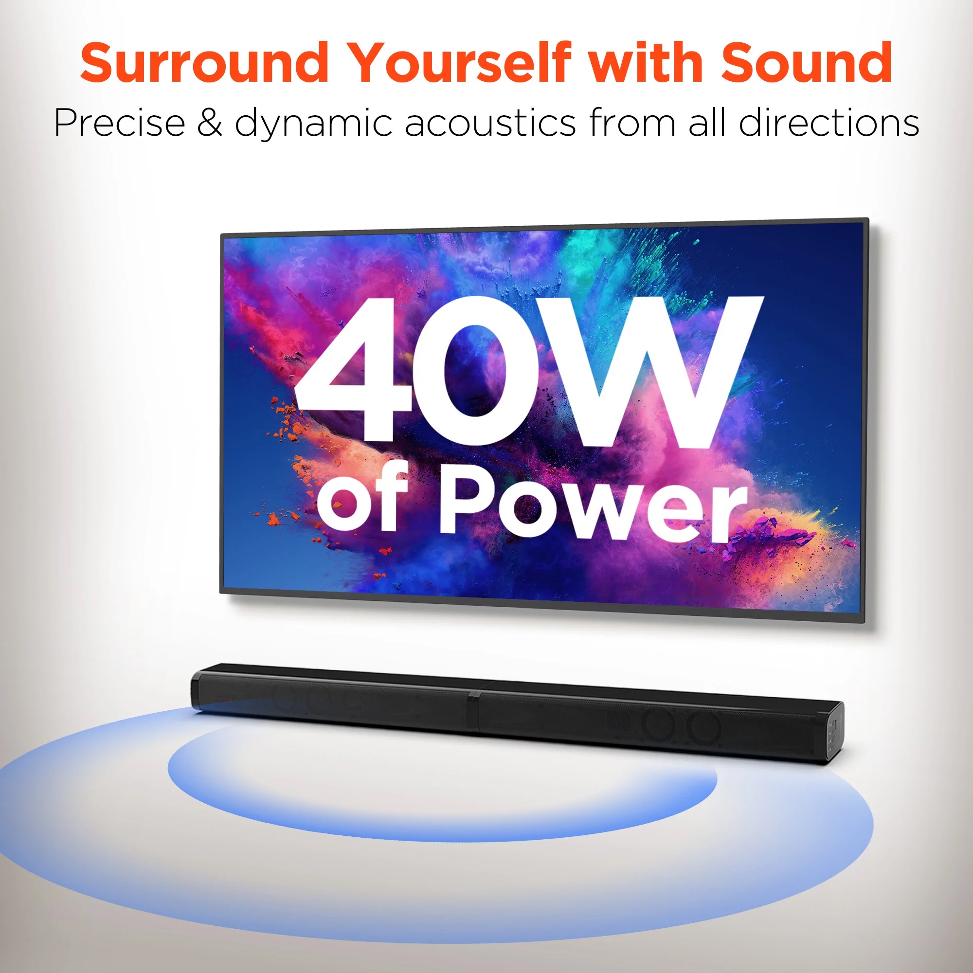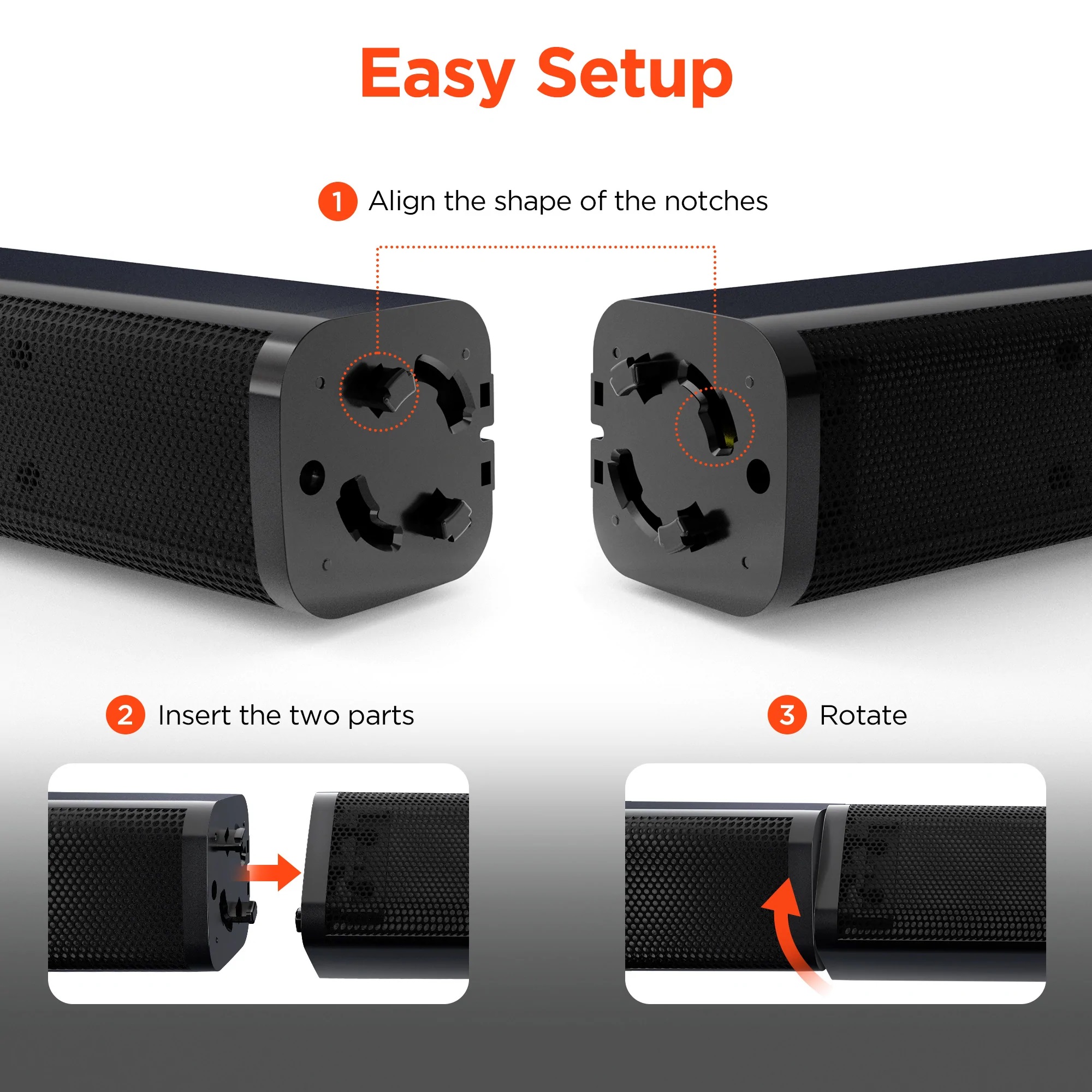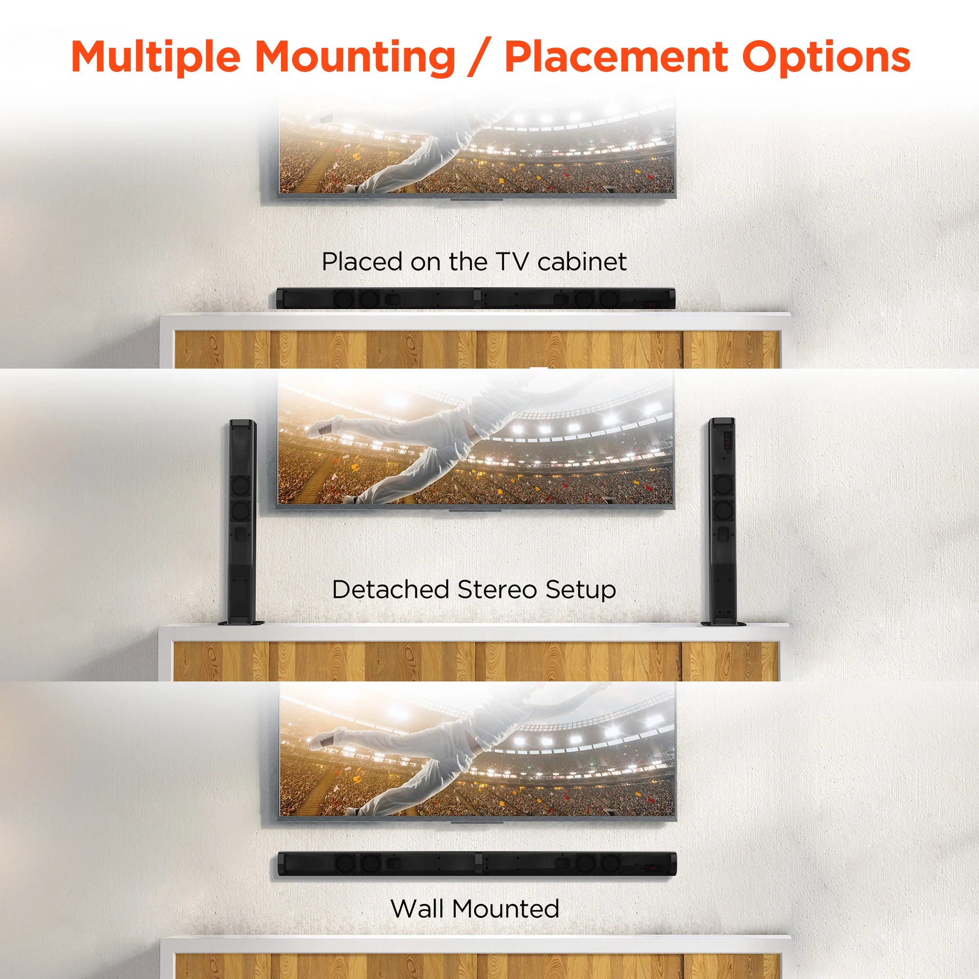 •  2-in-1 design. Works either as a fully mountable 37″ soundbar or detached for a dual-speaker stereo setup